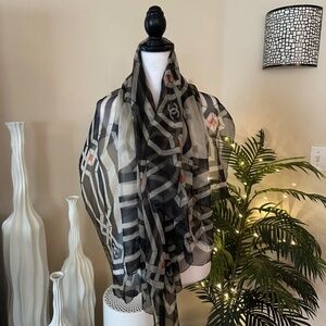 CHANEL Metallic Black & Cream Print Sheer Silk Scarf in Chanel Gift Box
