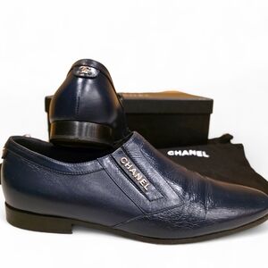 CHANEL Mocassins Loafers Navy Blue Womens 38.5 Full Set