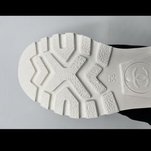Elegant black canvas sneakers with white laces. Features iconic CHANEL logo on the toe.