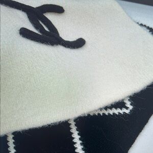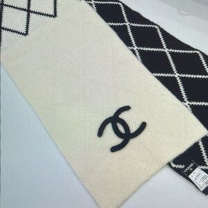 Luxurious CHANEL scarf featuring a striking black and white diamond pattern. Ideal for elevating any ensemble.