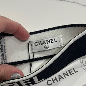 Stylish CHANEL hairband with bold logo. Classic black and white design. Perfect for any outfit.