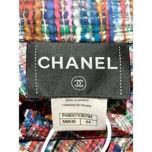 Luxurious Chanel coat featuring a vibrant multicolored tweed pattern in a modern silhouette. Made in France, this piece showcases signature Chanel craftsmanship with functional details like a hood and adjustable waist.
