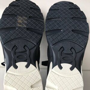 CHANEL NAVY LEATHER WHITE HEEL CC LOGO LACE UP SNEAKERS TRAINERS SHOES SIZE 38
