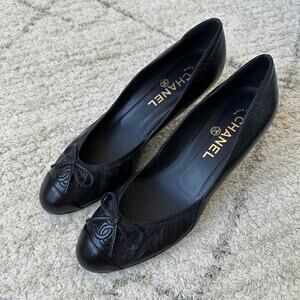 CHANEL Navy & Black Leather CC Logo Cap Toe Pumps IT 37