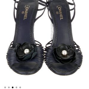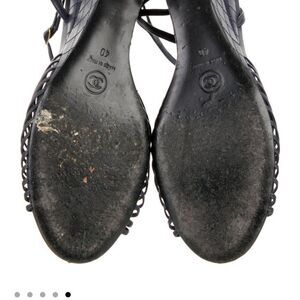 These stylish black wedge sandals from CHANEL feature a high wedge heel and an open-toe design with multiple delicate straps. The shoe is adorned with a decorative flower-like ornament where the straps meet, adding a touch of elegance to your look.