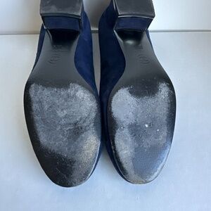 Elegant navy blue suede heels. Features iconic CHANEL logo. Comfortable block heel design.