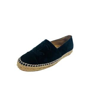 CHANEL Navy Blue Velvet CC Logo Cap Toe Espadrilles Monogram Flats Size 37 US 7