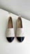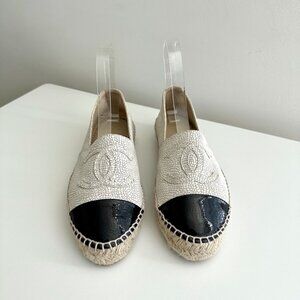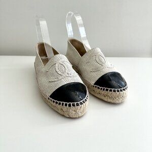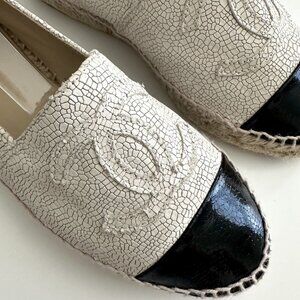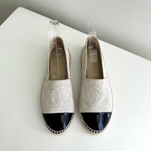 Details: off-white textured leather, black patent textured cap toe, large tonal textured CC logo on vamp, slip on style, nude leather insoles w/debossed designer logo, leather lining, espadrille trim, rubber soles w/CC embossed logo. Note: In certain lighting, off-white appears the lightest gray shade. Right rubber sole also appears darker due to storage. Overall beautiful!!!