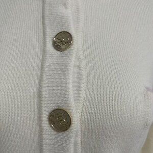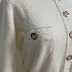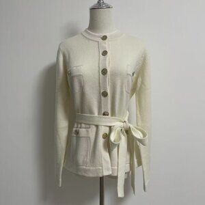 This CHANEL off-white knit cardigan opens with a classic crew neck design, featuring a row of exquisite buttons along the placket that showcase the brand's meticulous craftsmanship. Multiple pockets are strategically placed across the body, with metallic button accents along the pocket edges adding texture and detail to the overall look. The adjustable waist tie allows for a custom fit, accentuating the waistline to flatter the figure while lending a touch of effortless elegance to the ensemble. Complete with the brand's signature dust bag, this piece radiates luxury through its thoughtful details. Blending vintage charm with contemporary style, it effortlessly exudes French sophistication—whether worn for everyday outings or semi-formal occasions.