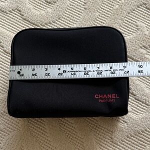 Sleek black Chanel cosmetics/toiletries pouch with red Parfums logo.