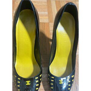 CHANEL PATENT PUMPS BLACK WITH YELLOW DETAIL