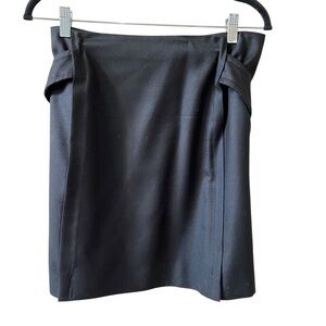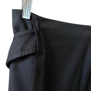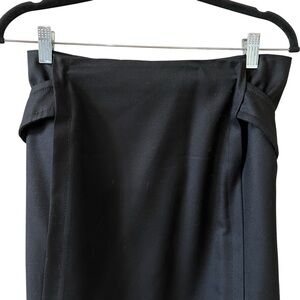 Solid black, 100% wool, side zip, belt buttons in back with single black logo button, unlined, hits just above the knee, career, professional, luxury, cocktails, elegant, formal, black tie, Paris. Chanel, wool pencil skirt, luxury fashion, high-end, classic design, women’s wear, tailored fit, sophisticated, elegant, timeless, chic, structured silhouette, above knee-length, minimalist, formal wear, versatile, office style, premium quality, couture, iconic brand, polished look, wardrobe essential.