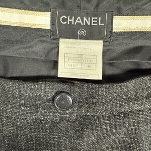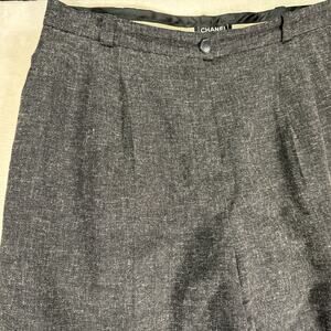 The CHANEL Paris Wide Leg Trousers Pants in Gray are a luxurious addition to any wardrobe. Made from a blend of silk, linen, cashmere, and wool, these pants feature a high-rise waist with a pleated front and a wide-leg design. Lined and cuffed, they are perfect for various occasions from casual to formal, with a touch of designer elegance. The classic fit and timeless style make these pants versatile for year-round wear, reflecting a sense of quiet luxury and sophistication. Made in France, they showcase the brand's iconic logo detail and are sure to make a statement in any chic outfit.