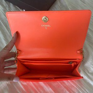 From the Cruise 2016 Collection. Neon orange quilted patent leather Chanel Boy Wallet On Chain with gold-tone hardware, single shoulder strap with chain-link and leather accents, single slit pocket at exterior, tonal leather interior, three pockets at interior walls; one with zip closure and flap with snap closure at front.