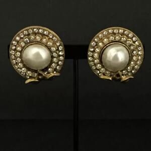 CHANEL Pearl Rhinestone Gold Tone Earrings