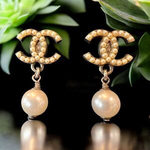 These exquisite CHANEL pierced earrings showcase the iconic CC logo in a luxurious gold finish, adorned with sparkling crystals. Below the logo, elegant cream pearl drops add a touch of timeless sophistication. The harmonious blend of textures and colors makes these earrings a standout accessory for any occasion.