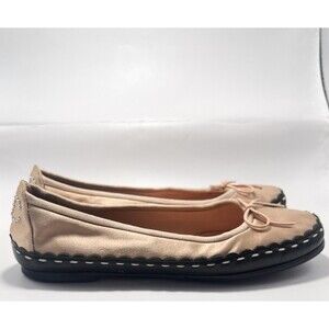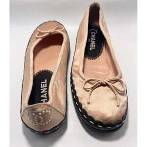 Elegant pink satin flats. Features black trim and bow detail. Iconic CHANEL branding.