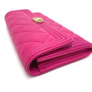 These are the key product attributes of the Chanel long wallet available in pink leather, with specific measurements and condition details provided.