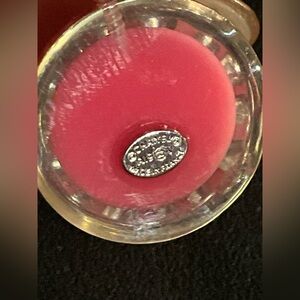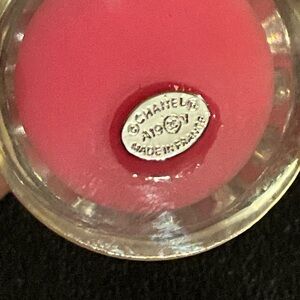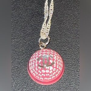Chic CHANEL necklace with a pink pendant. Features silver logo and sparkling details.