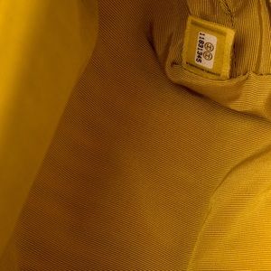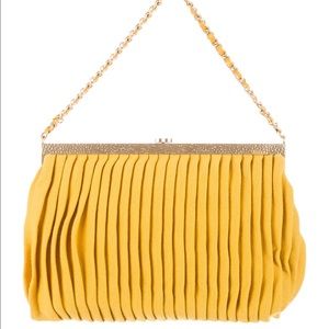 Yellow pleated Chanel Bow bag with gold-tone hardware, chain-link and leather woven shoulder strap, bow accent at front, CC logo at top, yellow woven interior lining and push-lock closure at top. Serial number reads 11831345.