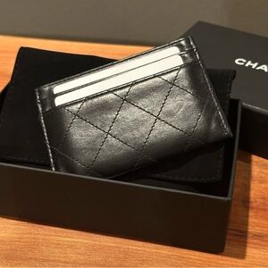 Luxurious CHANEL card holder in quilted black leather. Features iconic logo for a stylish touch. Ideal for keeping cards organized.