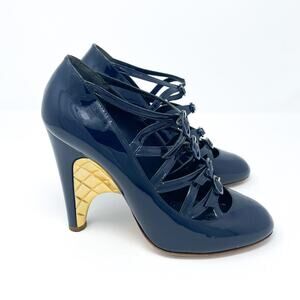 CHANEL Quilted Patent Leather Strappy Heels Navy Blue Gold EU 38