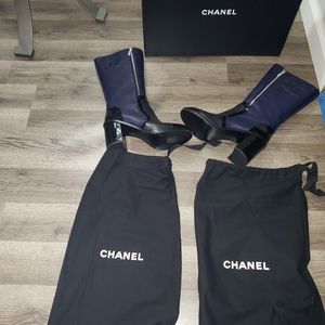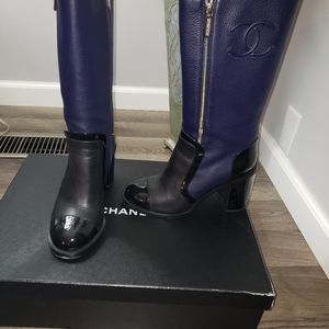Gorgeous Chanel navy blue and black caviar leather riding boots size 38.5 which is a US 8. Im an 8 and its a perfect fit! Comes with box and 2 Chanel boot dust bags. Worn just 2 times then I fell ill. Price is FIRM and may be open to VERY select trades! Boots are 2 years old.
