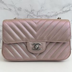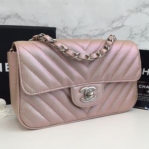The elusive and highly coveted 17b iridescent rose gold chevron rectangle mini with silver hardware. Sold out and impossible to find! 24 series. Worn once to an event. Like new condition. Comes with all of the original packaging!