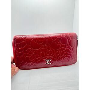 CHANEL - Red Camellia Embossed Lambskin Leather L Yen Wallet