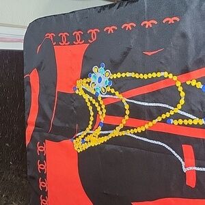 Elegant CHANEL scarf featuring bold red and black design. Iconic logo accents. Perfect for adding a touch of luxury.