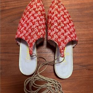 Chic CHANEL mules in red and gold tweed. Stylish and comfortable.
