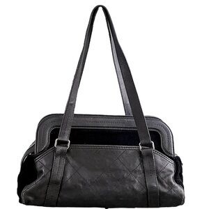 This authentic Chanel shoulder bag features luxurious black quilted leather and a structured framed top design. The bag is styled with double leather shoulder straps and a prominent silver-tone hardware plate engraved with "CHANEL" on the front. The silhouette is both structured and slightly slouchy, offering a stylish and practical everyday look.