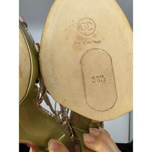 Step into timeless glamour with these stunning Chanel T-strap sandals from the 2015 collection. Crafted in a radiant rose gold metallic finish, these heels feature crystal-embellished straps, a secure buckle closure, and a sleek T-strap silhouette. The high block heel (approx. 5”) and slight platform provide added height and comfort. Elegant and bold, these statement heels are perfect for evening events, weddings, or elevating any luxury look. Made in Italy, marked with Chanel’s signature gold-tone insole branding.
