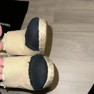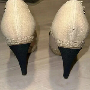 These are stunning and a staple to any closet. In a beautiful, beige linen, like material and rope edge accent. Heel is covered in a linen like material. Heel taps are due for a change. Right shoe back heel has a bit of discoloration and a very time tear (please turn to pics) In great conditions preloved conditions.