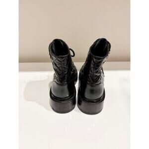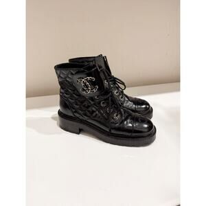 CHANEL Shiny Calfskin Quilted Lace Up Combat Boots with Metal Logo Black EU 37