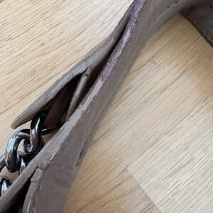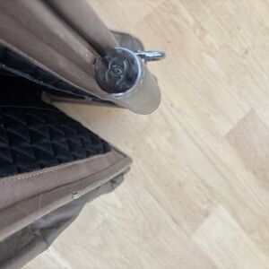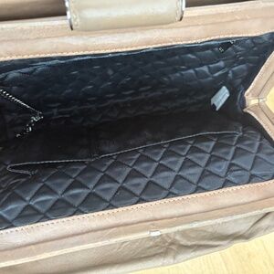 3 black quilted nylon compartments: Middle section has a zippered pocket plus 2 pouches (keys and cards?), two on either side are black quilted nylon Silver shoulder chain has leather cover for comfort of your shoulder