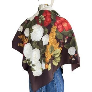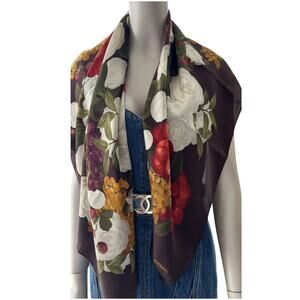 100% Authentic Chanel Silk Brown/Fruit & Camelia Flowers Prints Vintage Scarf
