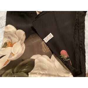 This beautiful luxury scarf features gorgeous white camelia flowers and fruit prints with a brown background and plump hand rolled edges.