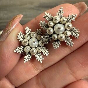 CHANEL Silver and Pearl Floral CC Logo Clip On Earrings