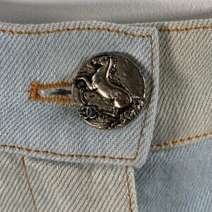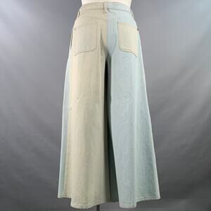 CHANEL casual pants in a blue and grey cotton woven denim twill featuring an extra wide leg style, button up leg details with silver tone metal equestrian buttons with CC monogram, and zip fly closure. Made in Italy.