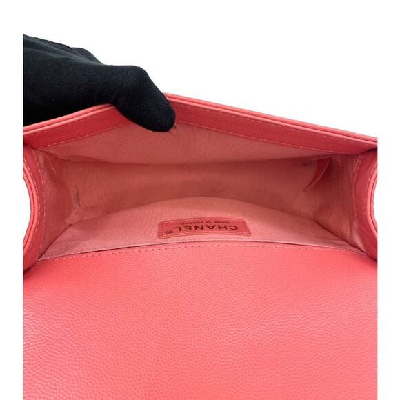 description: Chanel small pink caviar boy bag. condition The bag shows minor signs of use, both inside and out, but no noticeable scratches. body - No noticeable leather scratches and wear throughout the body, except for a scratch on the gold chain holder. interior - Good with minor signs of use. corners - No wear. bottom - No scratches and wear. handles and straps - Good with minor signs of use. Made in FRANCE / 25th Bag Regulations Please note that due to the location, method, material and design of the bag, a deviation of 1 to 3 cm may occur. liquids containing alcoholic chemicals, such as perfume or hand sanitizer, may deteriorate the leather. vigorous scrubbing of the bag with leather cleaners can remove the dye, even if the bag is not dyed, so please avoid using cleaners as much as possible. regardless of whether the pendant leather is dyed or not, please be aware that it may become sticky when stored in hot and humid places, such as in a hot car in summer or near heating appliances in winter. due to the nature of pendant leather, it may become dyed if it is left in contact with other products for a long time, so be sure to store it individually in a dust bag. Please note that Elabutique is not responsible for any damage caused by improper care.