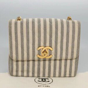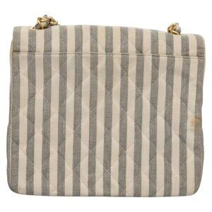 CHANEL Striped Matelasse Chain Shoulder Bag Canvas White Gray CC Auth