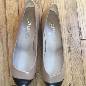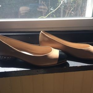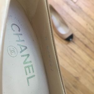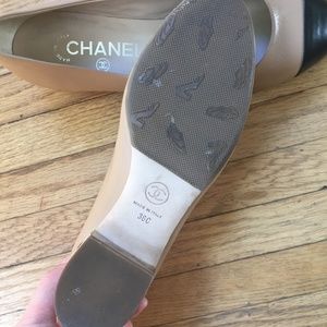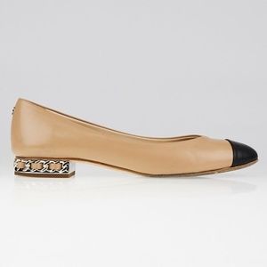 Perfect for the modern fashionista, these adorable flats feature the classic beige leather with black leather cap toes and an iconic chain/leather details around the heel. A small CC logo at the back of the heel completes the look. Padded leather insoles make these easy to wear all day. Wear these to work or for play!