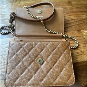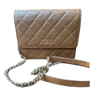 Experience timeless elegance with this CHANEL crossbody bag, crafted in luxurious tan quilted leather. The iconic CC logo and silver-tone chain strap interwoven with leather add a touch of sophistication to its classic design. Perfect for any occasion, this bag combines style and practicality effortlessly.