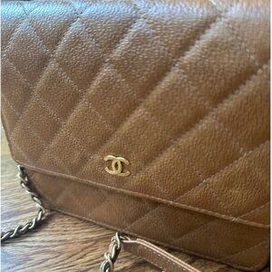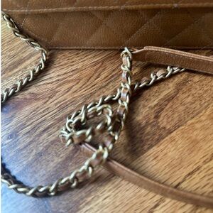 Camel/tan/brown/cognac colored micro Chanel print quilted leather