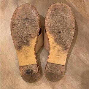 Elegant CHANEL slide sandals with tan leather and pink accents. Features iconic logo detail. Ideal for casual elegance.