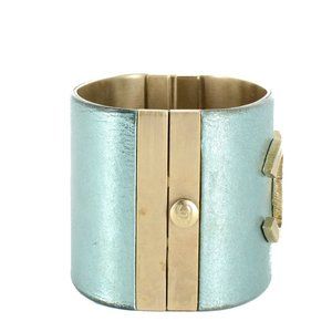 Bring a fashionable pop of color to your look with this unique Chanel cuff. It has a push-button clasp and bold CC logo.