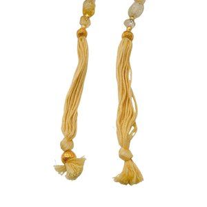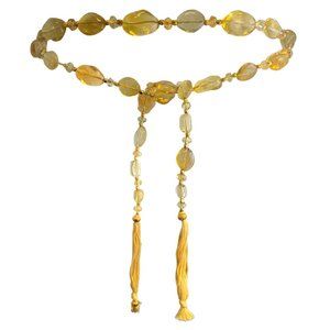 Description: Chanel Vintage Yellow Resin Stone and Gold CC Logo Charm Tassel Detail Belt from the 1999 collection.
