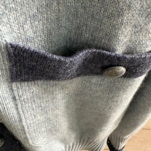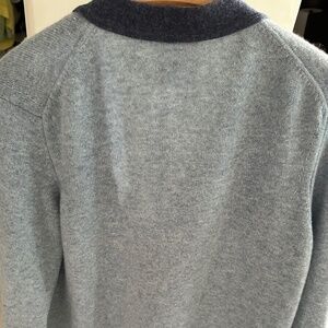 THIS SWEATER IS LIKE A HUE DENIN BLUE AND THE TRIM ON THE COLAR WITH A DARKER BLUE TRIM ON THE COLLAR, SLEEVES, FRONT AND BOTTOM OF THE SWEATER. IT FEATURES TWO SIDE POCKETS WITH THE ORNATE CC BUTTONS