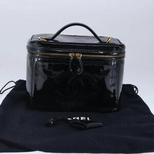 CHANEL Vanity Pouch Enamel Black Gold CC Auth
